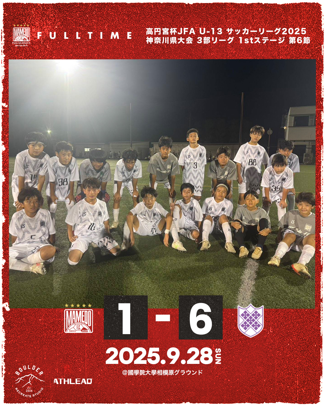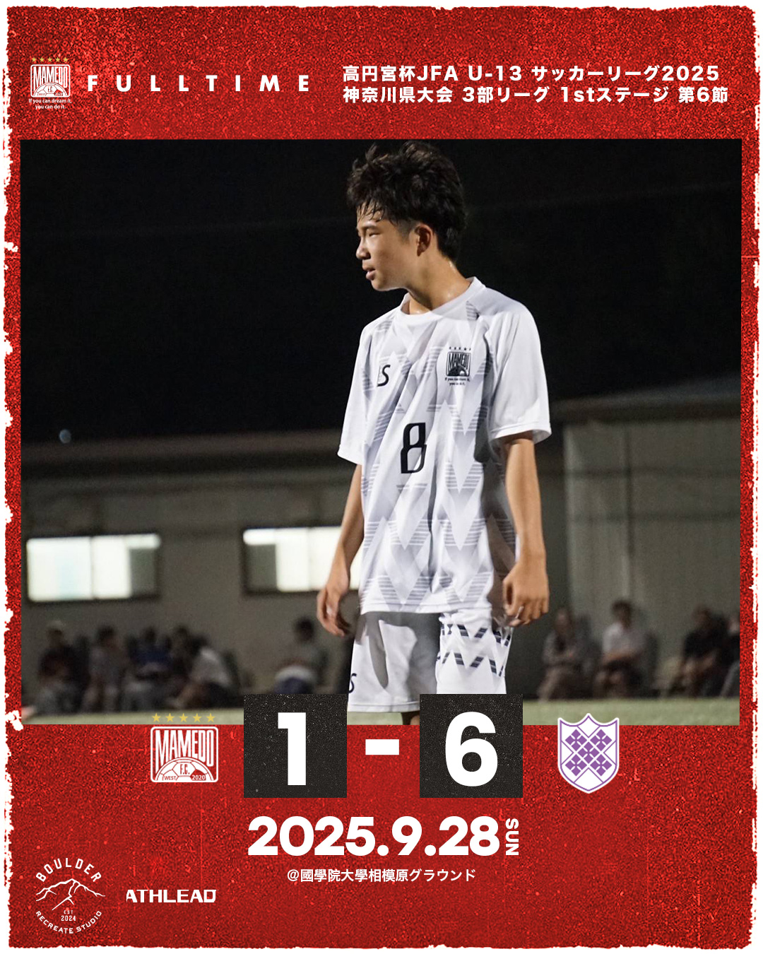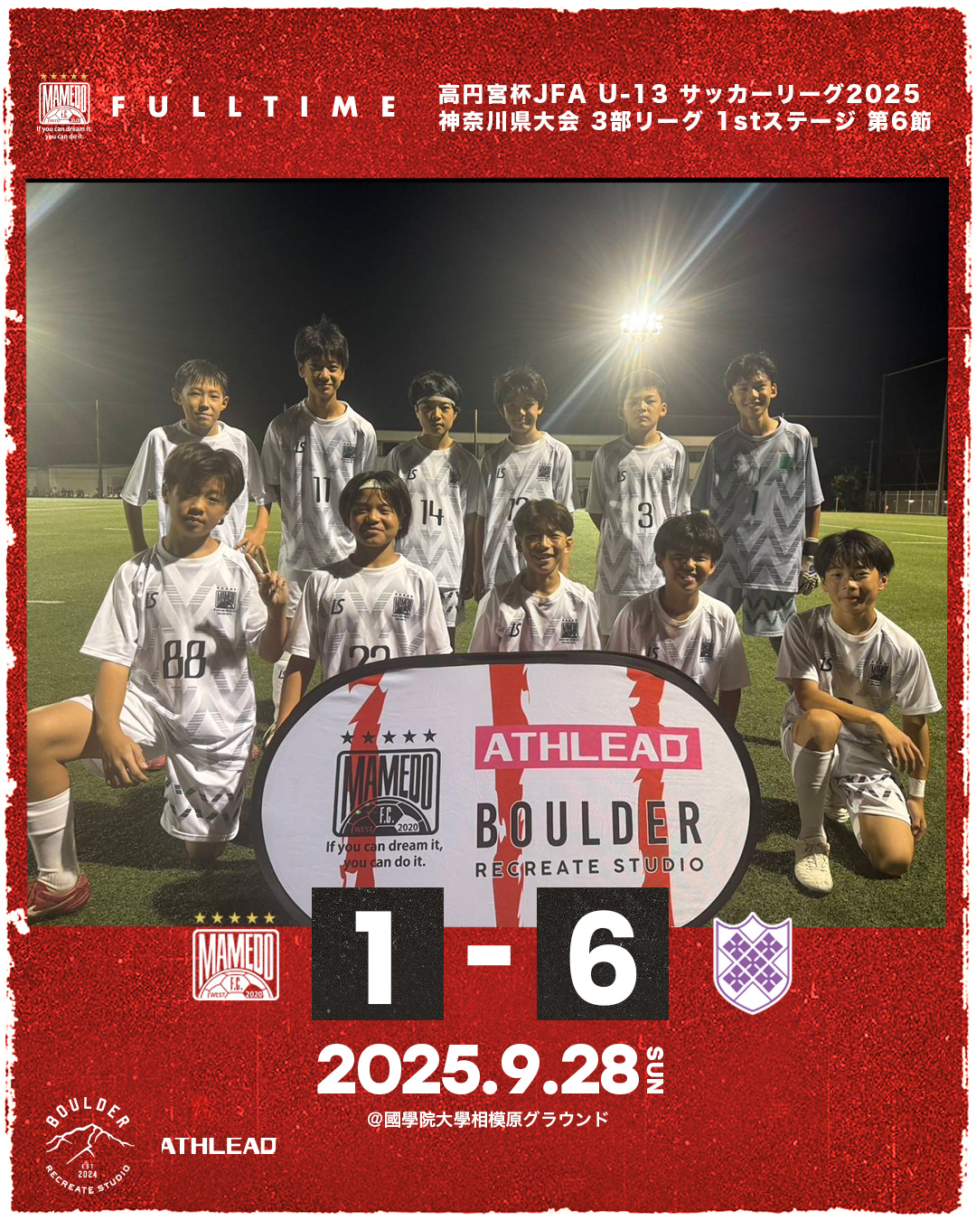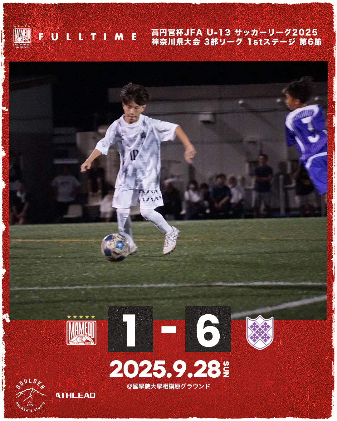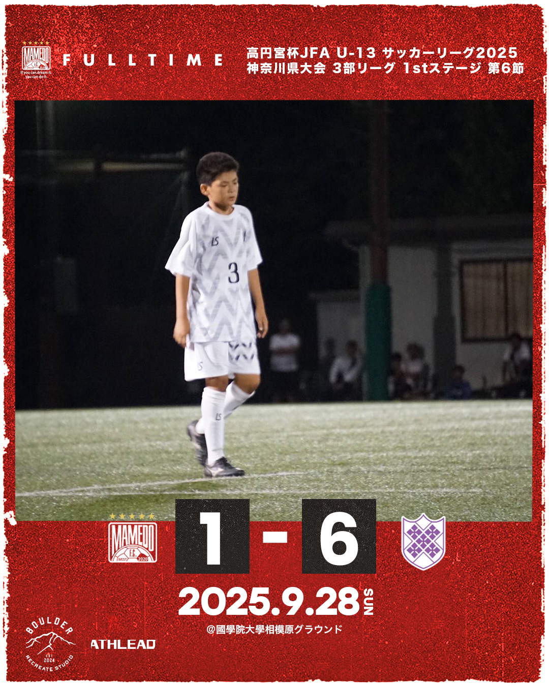 2025年9月28日 お知らせ U-13 神奈川県リーグ3部 1stステージ第6節 U-13 神奈川県リーグ3部 1stステージ第6節会場:國學院大學相模原グラウンド 対戦相手:FC HORTENCIAパープル スコア:1-6 先制するも追いつかれ相手の勢いを止めれず失点を重ねる。 先制し追加点のチャンスもあったからこそ悔しい敗戦となりました。 この悔しさを忘れず残り1節に向けて準備していきます。 mamedofcwest 10 Like