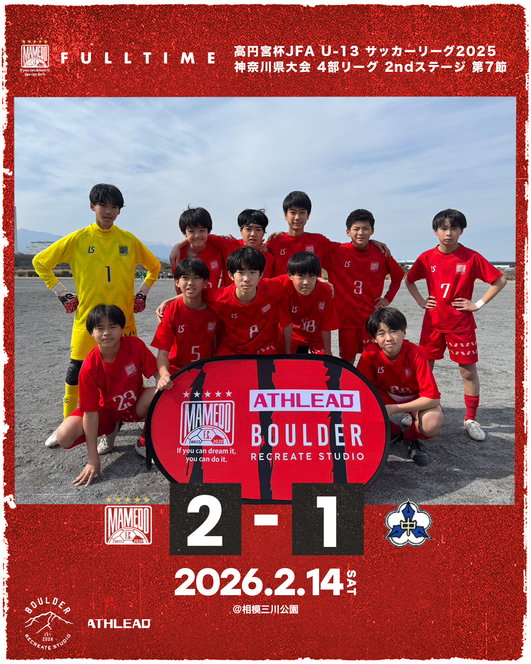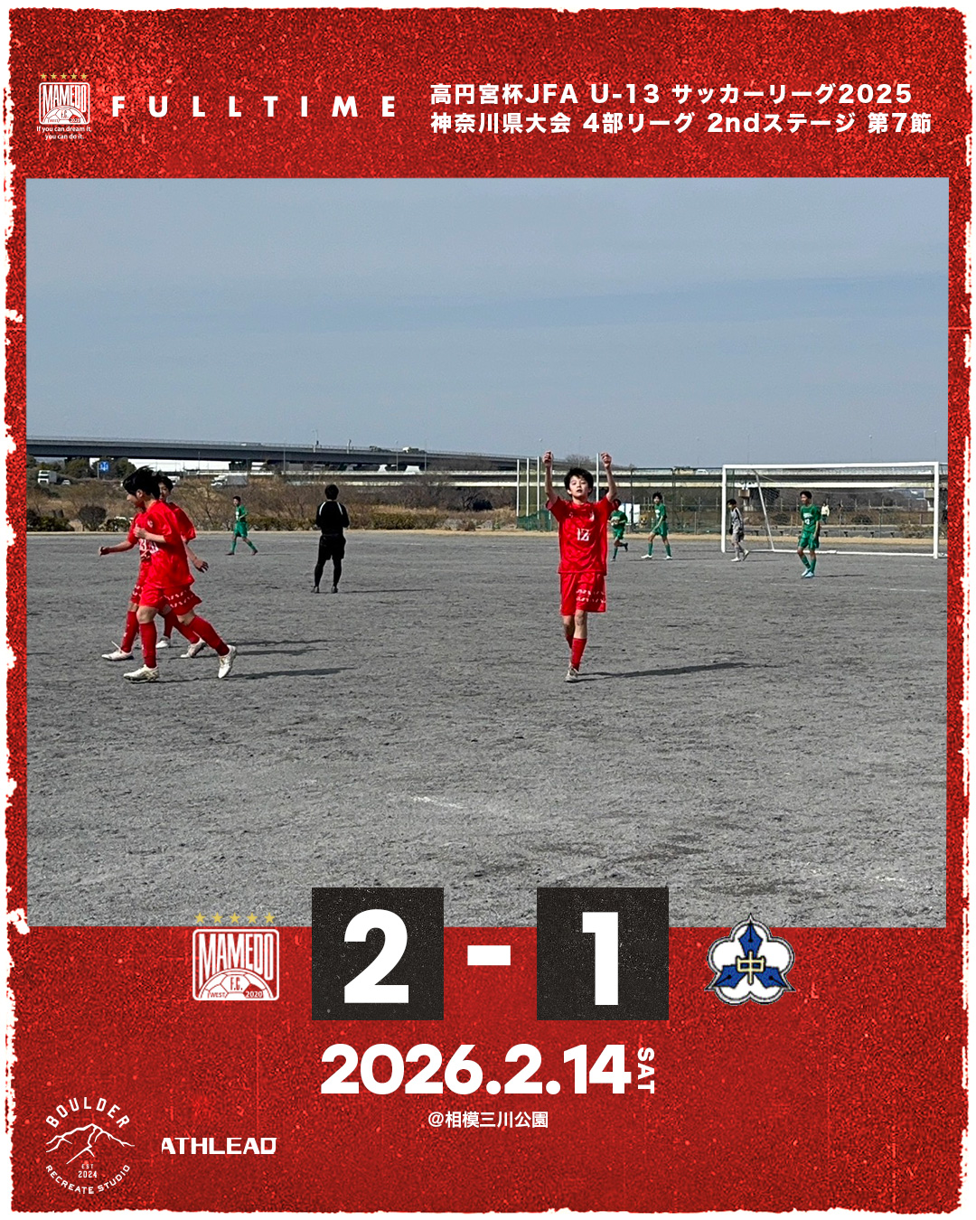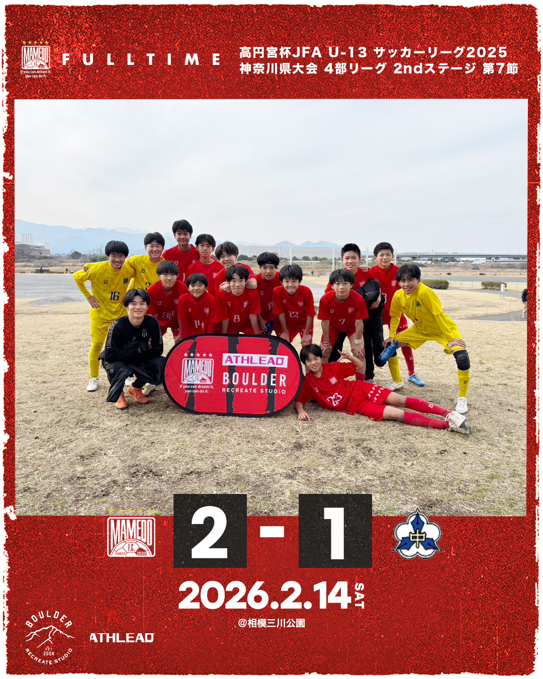 2026年2月14日 お知らせ U-13 神奈川県リーグ4部 2ndステージ 第7節 U-13 神奈川県リーグ4部 2ndステージ第7節会場:相模三川公園 対戦相手:川崎市立西中原中学校 スコア:2-1 得点者】 琉翔(篠原つばめSC)泰地(かながわクラブ) 先制点を奪うも追いつかれ苦しい展開が続きました。 後半終了間際に待望の逆転点弾を決め最終節を勝利で飾れました。 mamedofcwest 10 Like