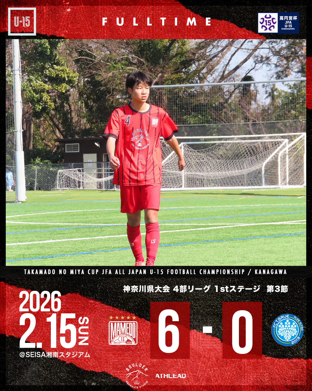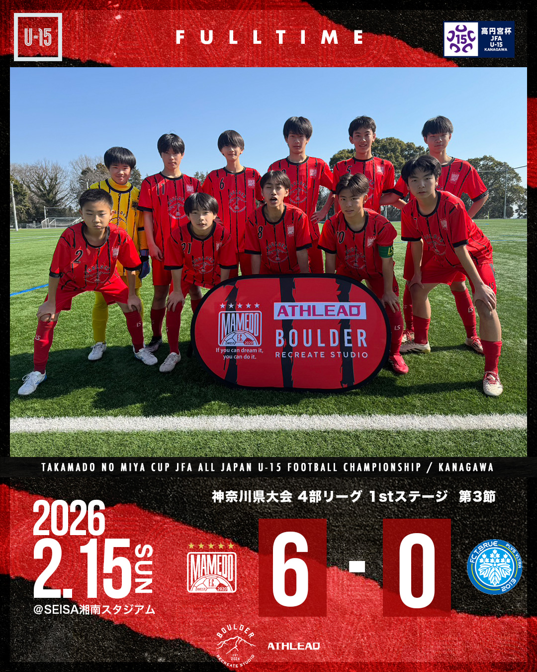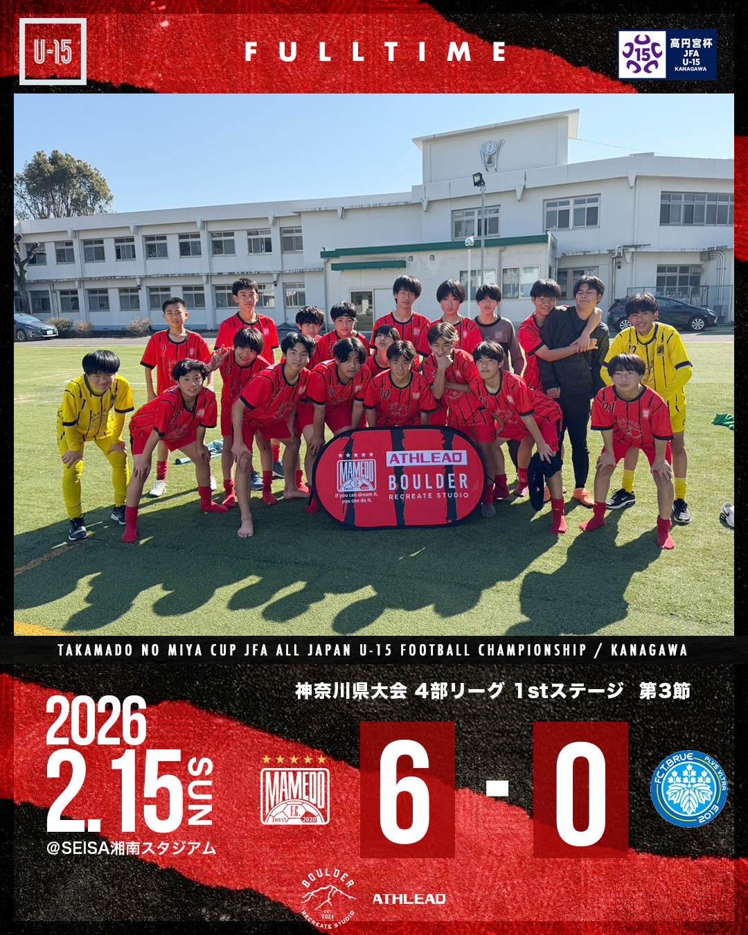 2026年2月16日 お知らせ U-15 神奈川県リーグ2026 4部 1stステージ第3節 高円宮杯JFAU-15サッカーリーグ2026 神奈川県大会 4部 1stステージ第3節会場:SEISA湘南スタジアム 対戦相手:FC T.BRUE スコア:6-0 攻め込むもなかなか得点が奪えず難しいゲーム展開でしたが、PKで先制。 後半はしっかり得点を奪い、守備陣もクリーンシートで連勝となりました。 mamedofcwest 12 Like