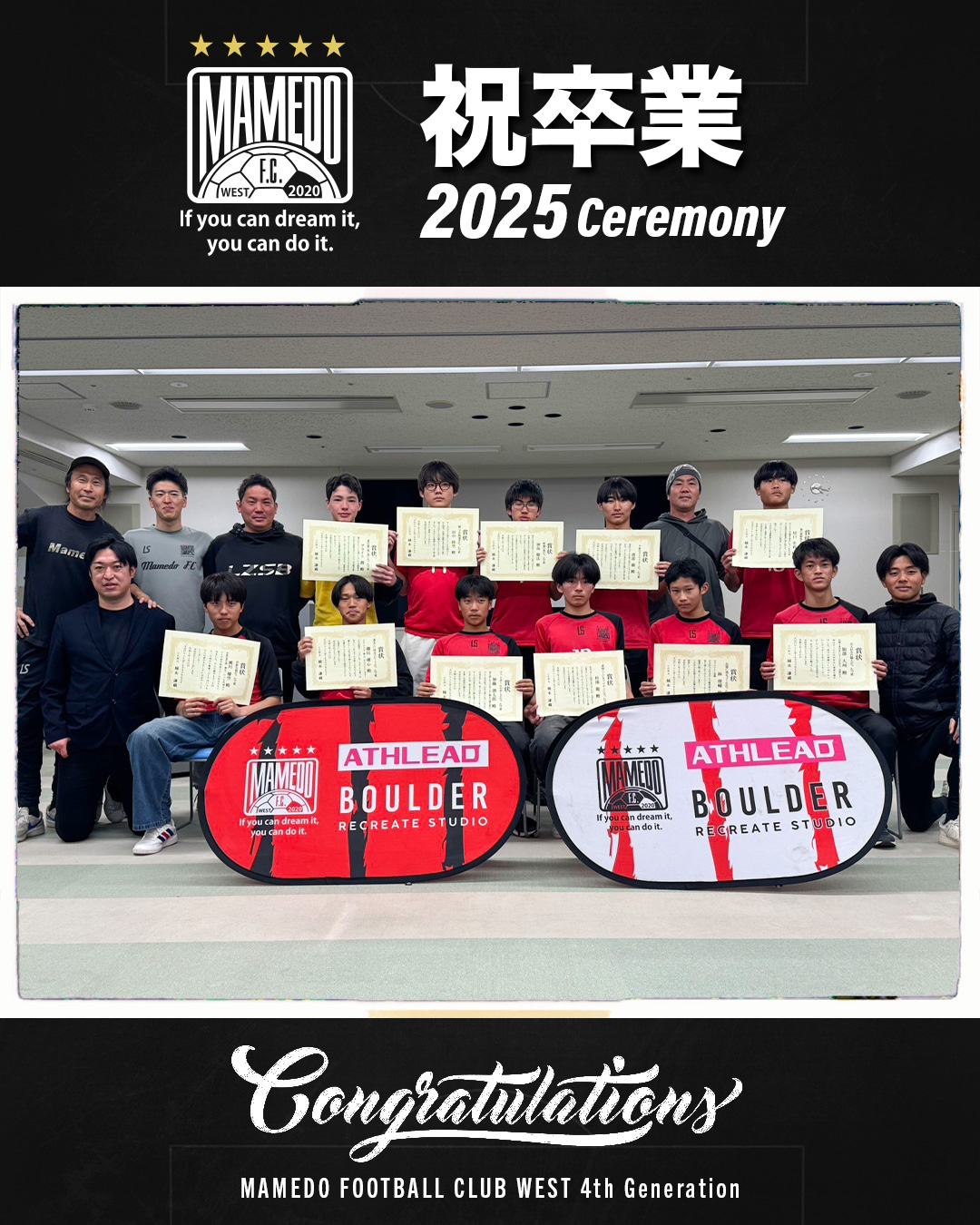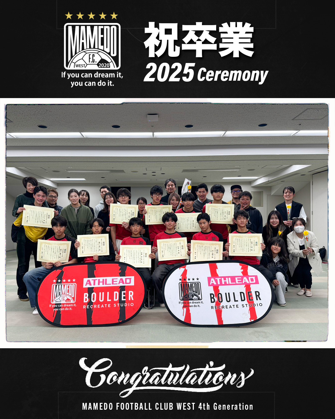 2026年3月15日 お知らせ, 卒業生集合写真 大豆戸FC WEST 4期生 卒業セレモニー 大豆戸FC WEST 4期生 卒業セレモニー 3/15(日)医化学センター大研修室大豆戸FC WEST全員が参加して行われた卒業セレモニー。卒業生一人一人が自分の言葉で思い出や仲間、後輩たち、コーチ、家族へのメッセージをスピーチしました。仲間がいたから楽しめた彼ららしい言葉がたくさん聞けた最高の時間となりました。 ここから新たなスタート。 4期生の今後の活躍を楽しみにしています。 mamedofcwest 2 Like